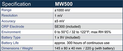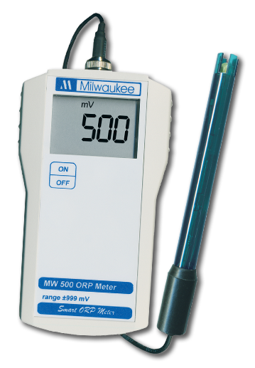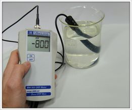MW500 performs ORP measurements with a range of ±1000 mV. The meter is supplied with ORP electrode and calibration solutions. Just immerse the ORP electrode into the water and turn the instrument on by pressing the ON/OFF key. (Allow the reading to stabilize before taking measurements.) |